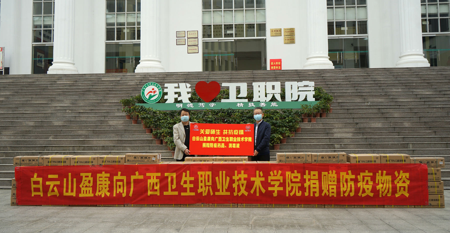 新冠無情,盈康有(yǒu)愛。2020年(nián)3月11日下午,廣西白雲山盈康藥業有(yǒu)限公司董事長(cháng)程宏輝、黨總支書記黃平權攜公司領導班子(zǐ)、相關部門負責人來到廣西衛生職業技術學(xué)院為(wèi)全校師生捐贈500ml75%乙醇消毒液1500瓶、50ml75%乙醇消毒液2000瓶、維C銀翹片2000瓶等一(yī)批防疫物資。廣西衛生職業技術學(xué)院院長(cháng)周元明、黨委副書記王鑫,副院長(cháng)程一(yī)波、嶽桂華、農星東及學(xué)院黨政辦、組織部、後勤處等處室負責人參加捐贈儀式。
