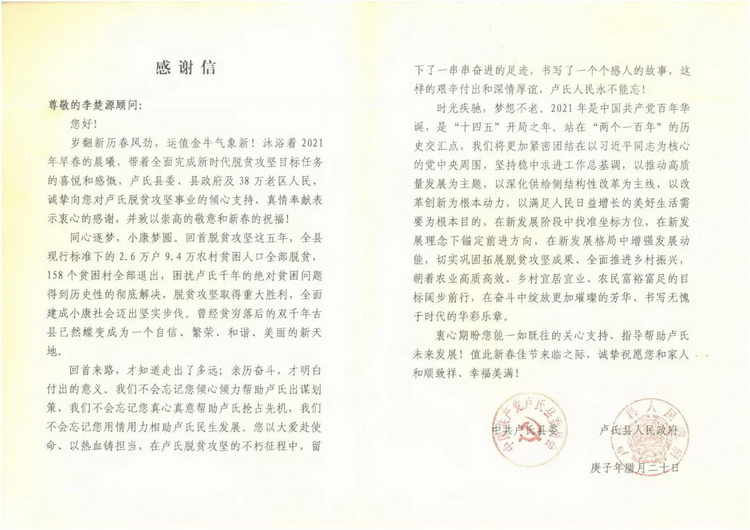 ▲來自(zì)盧氏縣人民政府的(de)感謝信