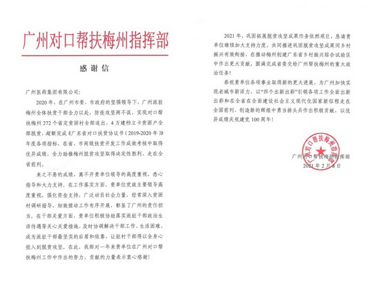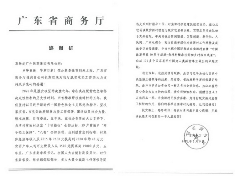 廣藥集團“造血式扶貧”備受好評,開年(nián)以後,廣藥集團先後收到了盧氏縣人民政府、廣州對口幫扶梅州指揮部、廣東省商(shāng)務廳發來的(de)感謝信。信中肯定了廣藥集團在助力盧氏縣擺脫貧困、助推梅州脫貧攻堅取得勝利、精準幫扶角灣村脫貧奔康等方面所做(zuò)出的(de)貢獻并對廣藥集團表示了感謝。