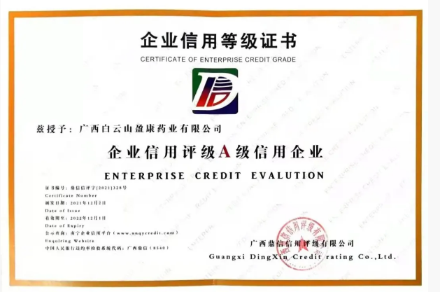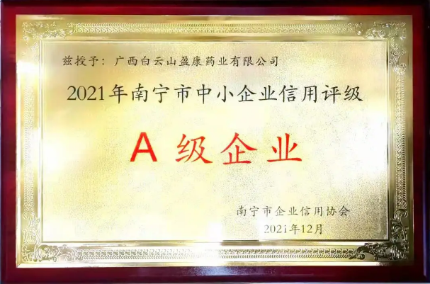 近日,白雲山盈康再次獲評為(wèi)2021年(nián)南甯市(shì)企業信用評級A級信用企業。這是公司自(zì)2019年(nián)首次申報以來,已連續三年(nián)獲評為(wèi)南甯市(shì)企業信用評級A級信用企業。