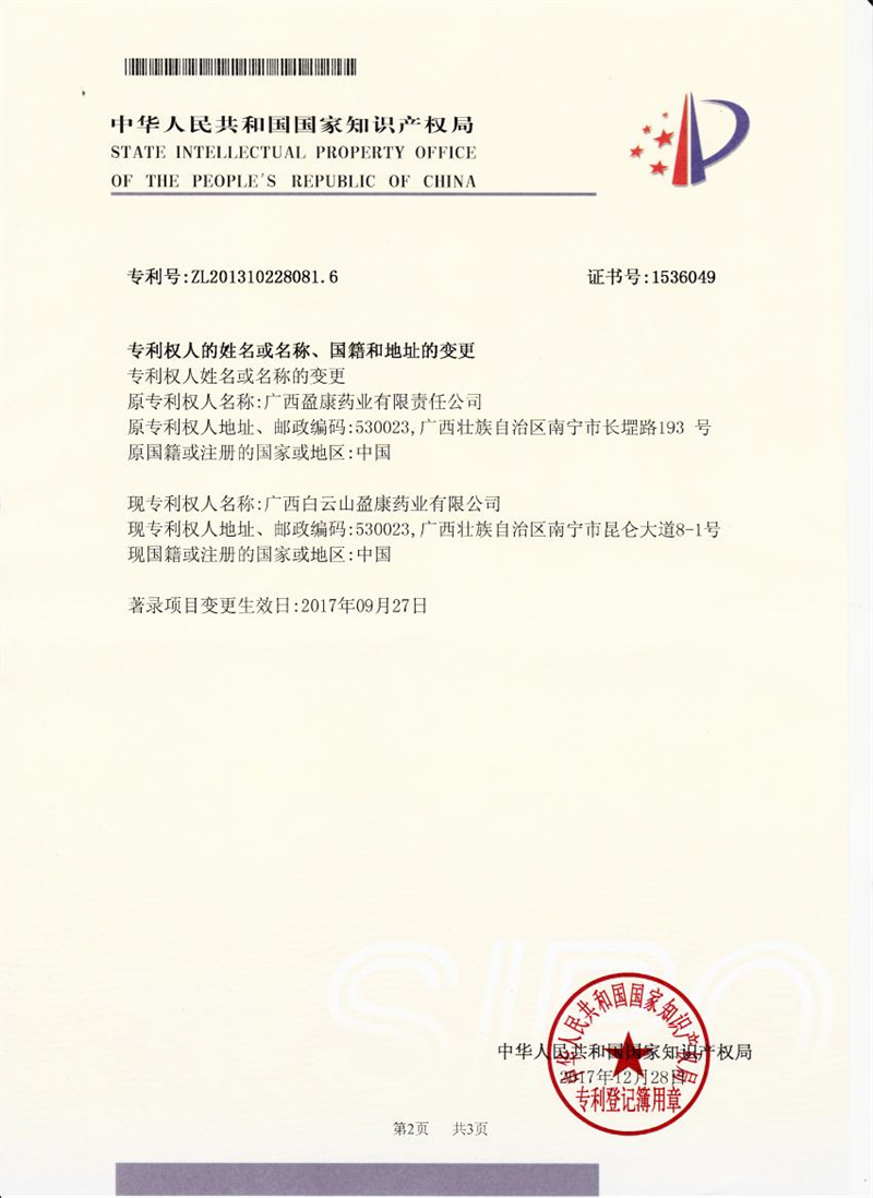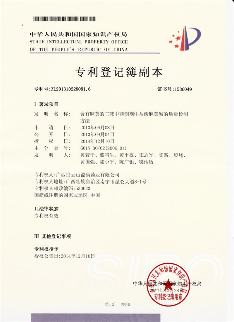 含有(yǒu)麻黃的(de)三味中藥制劑中鹽酸麻黃堿的(de)質量檢測方法 專利證書+著錄登記薄