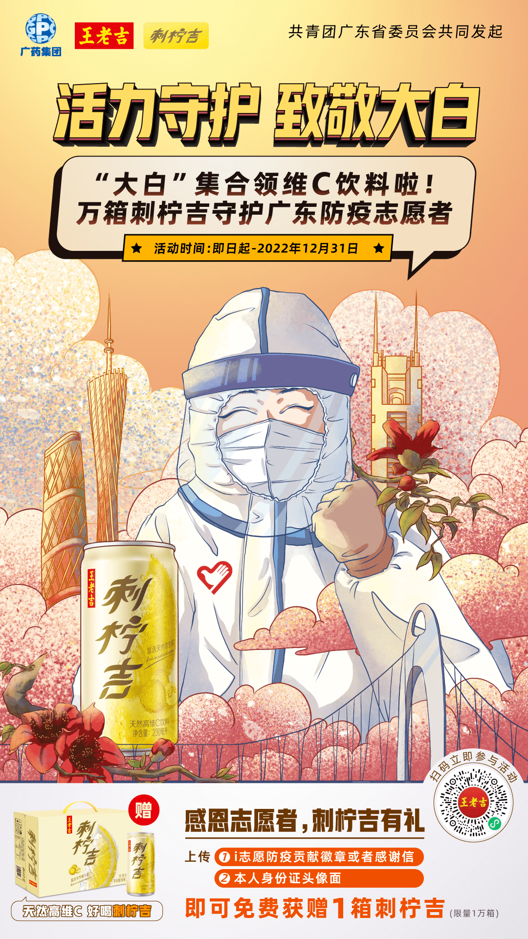 廣藥集團王老吉大健康公司聯合共青團廣東省委員會共同開啓“活力守護 緻敬大白”公益活動,為(wèi)廣東防疫志願者送上萬箱刺檸吉維C飲料。
