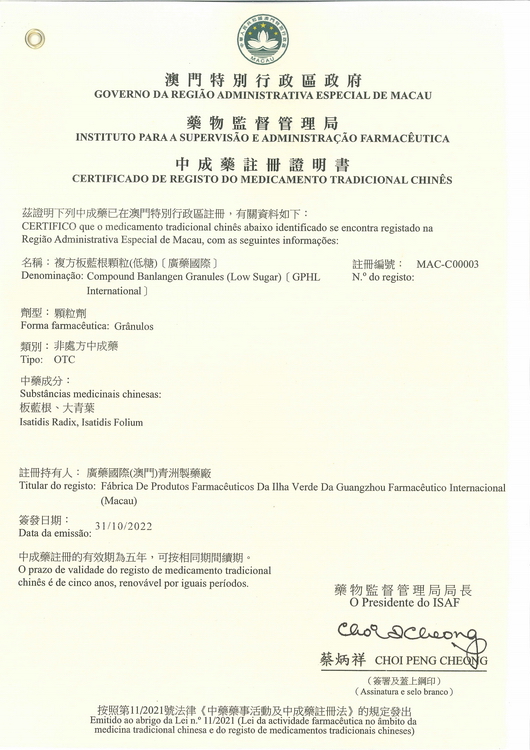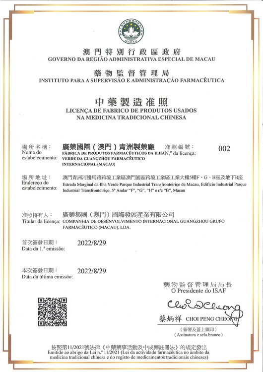 2022年(nián)8月,廣藥集團旗下廣藥國(guó)際(澳門)青洲制藥廠獲頒澳門 第一(yī)個中藥口服固體制劑(含外用藥搽劑)中藥制造準照,是同類型準照中包含的(de)中成藥劑型最多的(de);2022年(nián)10月,廣藥集團的(de)拳頭産品複方闆藍根顆粒(低(dī)糖)成功獲批澳門中成藥注冊證,是澳門《中藥藥事活動及中成藥注冊法》實施以及澳門藥物監督管理(lǐ)局揭牌成立以來,頒布的(de) 第一(yī)個口服創新型同名同方新藥批文;2022年(nián)12月,廣藥國(guó)際(澳門)青洲制藥廠獲得了 澳門第一(yī)張中藥制造企業GMP證書,由此形成了與國(guó)際接軌的(de)澳門中成藥制造GMP标準;今年(nián)2月,廣藥國(guó)際(澳門)青洲制藥廠的(de)廣藥國(guó)際靈芝孢子(zǐ)油30/60粒裝通過了 香港工業總會優質标志局的(de)「Q唛」優質産品認證和(hé)澳門産品「M嘜」優質認證。